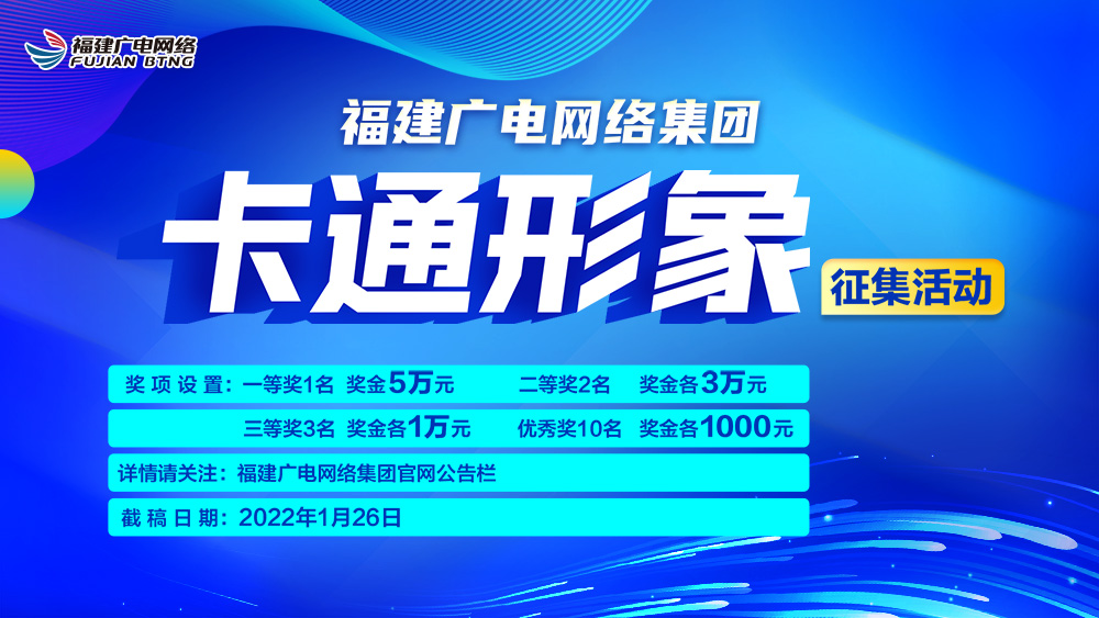 2022年将迎来集团成立十周年,为打造福建广电网络集团党媒政网的全新形象,提升福建广电网络集团品牌亲和力、影响力,现向全社会公开举办卡通形象征集活动。